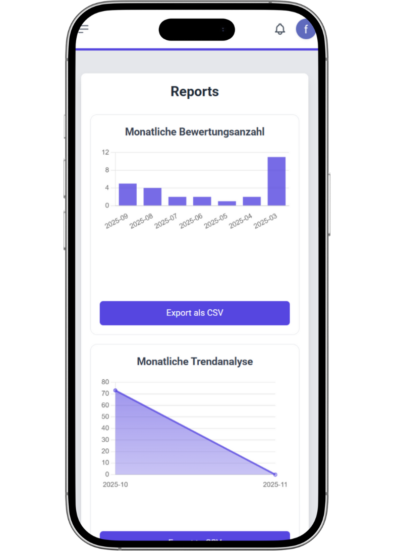 Monatliche Leistungsberichte bieten Einblicke in Bewertungstrends, Kundenstimmungen und wichtige Verbesserungsbereiche.